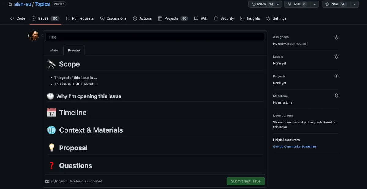 문제나 결정에 대한 생각을 가능한 한 효과적으로 전달하는 데 도움이 되도록 각 issue는 동일한 템플릿을 제공합니다. 이 구조는 주니어 사람들에게 문제를 분해하는 방법을 가르치면서 한 단계 더 나아갈 수 있게 합니다.